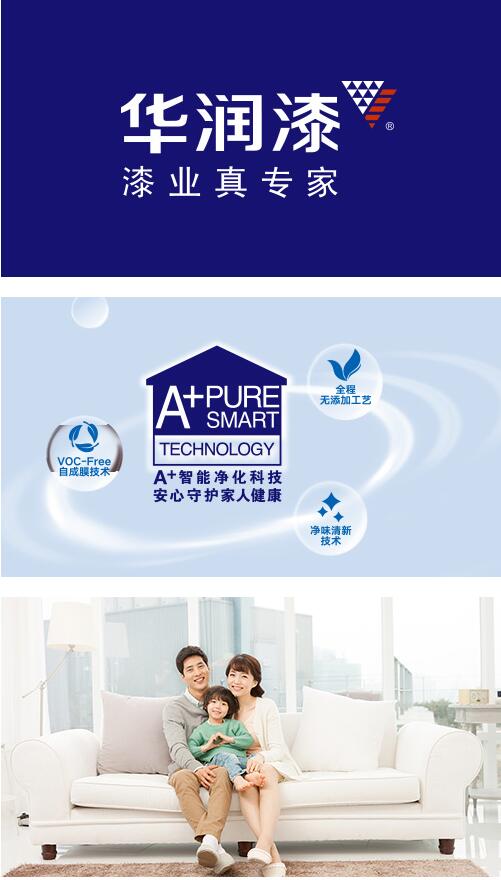 ——华润漆A+ 保护我全家华润漆A+系列产品先后获得法国室内环境空气检测最高级别A+认证以及美国绿色卫士室内空气质量金级认证。A+ 智能净化科技不止净味,更确保涂刷后24小时即可安心入住。